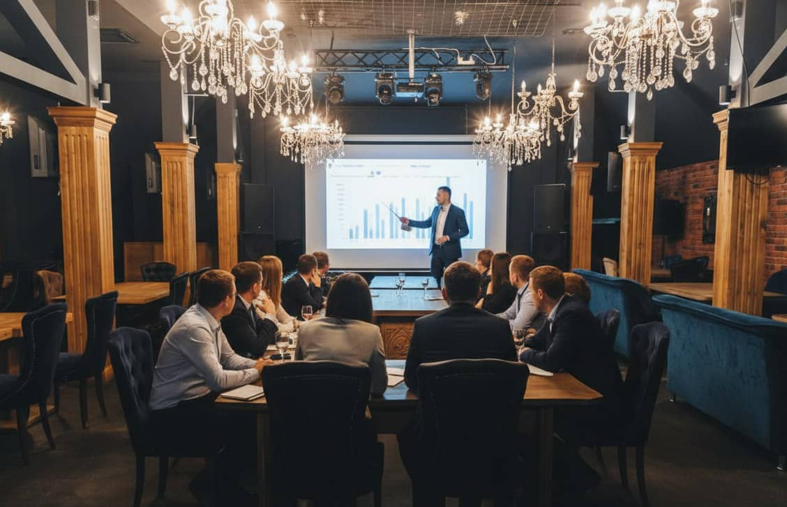 Планировка зала легко адаптируется под формат мероприятия — от камерных встреч до событий с активной программой и шоу-элементами.